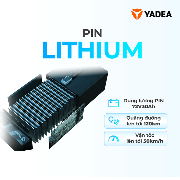 Yadea Oris H được trang bị pin lithium với dung lượng lớn 72V30Ah cho phép xe đi được tới 120 km (*điều kiện tiêu chuẩn) chỉ với một lần sạc. Pin lithium thế hệ mới có năng lượng cao, xả điện ổn định, an toàn vượt trội, và tuổi thọ lâu dài. Ngay cả khi sử dụng trong nhiệt độ cao, pin vẫn đảm bảo an toàn.